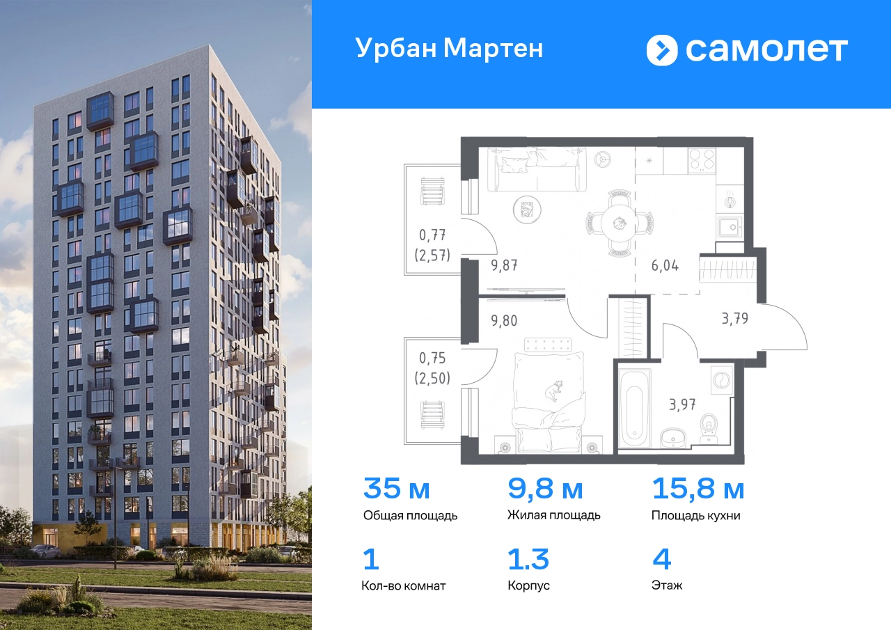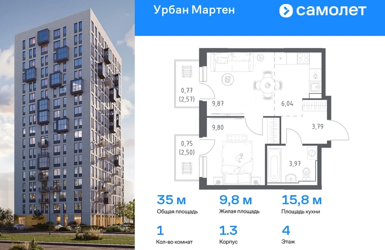 Предлагается 1-комнатная квартира комфорт-класса 34,99 кв.м в корпусе 1.3 на 4 этаже, в ЖК "Урбан Мартен" Квартира без отделки. Доступность опции "отделка" и возможность комплектации мебелью и декором уточняйте у застройщика. Планировкой предусмотрены: Прихожая - 3,79 м² Кухня-ниша - 6,04 м² Жилая_комната_1 - 9,87 м² Жилая_комната_2 - 9,8 м² Су_1 - 3,97 м² Балкон_1 - 0,75 м² Балкон_2 - 0,77 м² Приобрести квартиру возможно по специальным акциям от застройщика, с текущими условиями акций можно ознакомиться в блоке “Акций”. Цена динамическая и может отличаться, уточняйте актуальность у застройщика. В жилом комплексе «Урбан Мартен» у вас будет собственная Уфа: домашняя, неторопливая, теплая. Здесь дети будут играть во дворе без машин в догонялки, собака сможет бегать за палкой по пляжу, а с соседями получится встречаться не только у лифта, но и на утренних занятиях йогой на зеленой лужайке рядом с домом. Жилой комплекс «Урбан Мартен» находится в Демском районе — самом тихом и зеленом в Уфе. Здесь можно открывать окна нараспашку, чтобы квартира наполнялась свежим воздухом, и наблюдать с балкона, как покачиваются макушки деревьев. #yan19-2r1737179#О застройщике