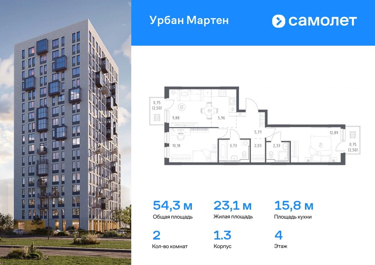 Предлагается 2-комнатная квартира комфорт-класса 54,27 кв.м в корпусе 1.3 на 4 этаже, в ЖК "Урбан Мартен" Квартира без отделки. Доступность опции "отделка" и возможность комплектации мебелью и декором уточняйте у застройщика. Планировкой предусмотрены: Прихожая - 5,77 м² Кухня-ниша - 5,96 м² Жилая_комната_1 - 9,88 м² Жилая_комната_2 - 10,18 м² Жилая_комната_3 - 12,89 м² Су_1 - 3,73 м² Су_2 - 2,33 м² Гардероб - 2,03 м² Балкон_1 - 0,75 м² Балкон_2 - 0,75 м² Приобрести квартиру возможно по специальным акциям от застройщика, с текущими условиями акций можно ознакомиться в блоке “Акций”. Цена динамическая и может отличаться, уточняйте актуальность у застройщика. В жилом комплексе «Урбан Мартен» у вас будет собственная Уфа: домашняя, неторопливая, теплая. Здесь дети будут играть во дворе без машин в догонялки, собака сможет бегать за палкой по пляжу, а с соседями получится встречаться не только у лифта, но и на утренних занятиях йогой на зеленой лужайке рядом с домом. Жилой комплекс «Урбан Мартен» находится в Демском районе — самом тихом и зеленом в Уфе. Здесь можно открывать окна нараспашку, чтобы квартира наполнялась свежим воздухом, и наблюдать с балкона, как покачиваются макушки деревьев. #yan19-2r1737181#О застройщике