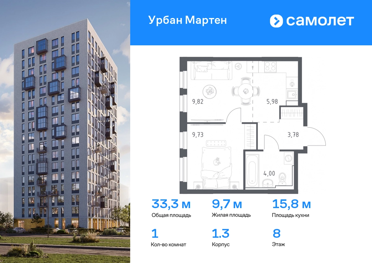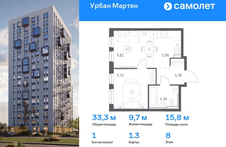 Предлагается 1-комнатная квартира комфорт-класса 33,31 кв.м в корпусе 1.3 на 8 этаже, в ЖК «Урбан Мартен» Квартира с предчистовой отделкой. Доступность дополнительных опций уточняйте у застройщика. Приобрести квартиру возможно по специальным акциям от застройщика, с текущими условиями акций можно ознакомиться в блоке “Акций”. Цена динамическая и может отличаться, уточняйте актуальность у застройщика. В жилом комплексе «Урбан Мартен» у вас будет собственная Уфа: домашняя, неторопливая, теплая. Здесь дети будут играть во дворе без машин в догонялки, собака сможет бегать за палкой по пляжу, а с соседями получится встречаться не только у лифта, но и на утренних занятиях йогой на зеленой лужайке рядом с домом. Жилой комплекс «Урбан Мартен» находится в Демском районе — самом тихом и зеленом в Уфе. Здесь можно открывать окна нараспашку, чтобы квартира наполнялась свежим воздухом, и наблюдать с балкона, как покачиваются макушки деревьев. #yan19-2r1737217#О застройщике