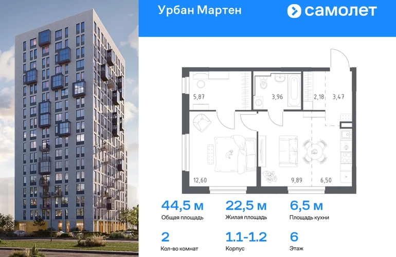 Строим кварталы для жизни с заботой о будущем. Предлагается 2-комнатная квартира комфорт-класса 44,66 кв.м в корпусе 1.1-1.2 на 6 этаже, в ЖК «Урбан Мартен» Квартира с чистовой отделкой. Доступность дополнительных опций уточняйте у застройщика. Приобрести квартиру возможно по специальным акциям от застройщика, с текущими условиями акций можно ознакомиться в блоке «Акций». Цена динамическая и может отличаться, уточняйте актуальность у застройщика. В жилом комплексе «Урбан Мартен» у вас будет собственная Уфа: домашняя, неторопливая, теплая. Здесь дети будут играть во дворе без машин в догонялки, собака сможет бегать за палкой по пляжу, а с соседями получится встречаться не только у лифта, но и на утренних занятиях йогой на зеленой лужайке рядом с домом. Жилой комплекс «Урбан Мартен» находится в Демском районе — самом тихом и зеленом в Уфе. Здесь можно открывать окна нараспашку, чтобы квартира наполнялась свежим воздухом, и наблюдать с балкона, как покачиваются макушки деревьев. #yan19-2r1746737#О застройщике