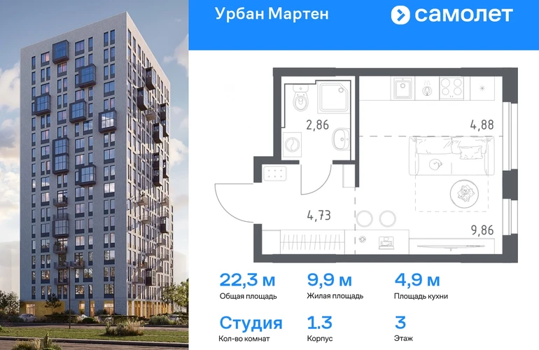 Предлагается квартира студия комфорт-класса 22,33 кв.м в корпусе 1.3 на 3 этаже, в ЖК "Урбан Мартен" Квартира без отделки. Доступность опции "отделка" и возможность комплектации мебелью и декором уточняйте у застройщика. Планировкой предусмотрены: Прихожая - 4,73 м² Кухня-ниша - 4,88 м² Студия - 9,86 м² Су_1 - 2,86 м² Приобрести квартиру возможно по специальным акциям от застройщика, с текущими условиями акций можно ознакомиться в блоке “Акций”. Цена динамическая и может отличаться, уточняйте актуальность у застройщика. В жилом комплексе «Урбан Мартен» у вас будет собственная Уфа: домашняя, неторопливая, теплая. Здесь дети будут играть во дворе без машин в догонялки, собака сможет бегать за палкой по пляжу, а с соседями получится встречаться не только у лифта, но и на утренних занятиях йогой на зеленой лужайке рядом с домом. Жилой комплекс «Урбан Мартен» находится в Демском районе — самом тихом и зеленом в Уфе. Здесь можно открывать окна нараспашку, чтобы квартира наполнялась свежим воздухом, и наблюдать с балкона, как покачиваются макушки деревьев. #yan19-2r1747845#О застройщике