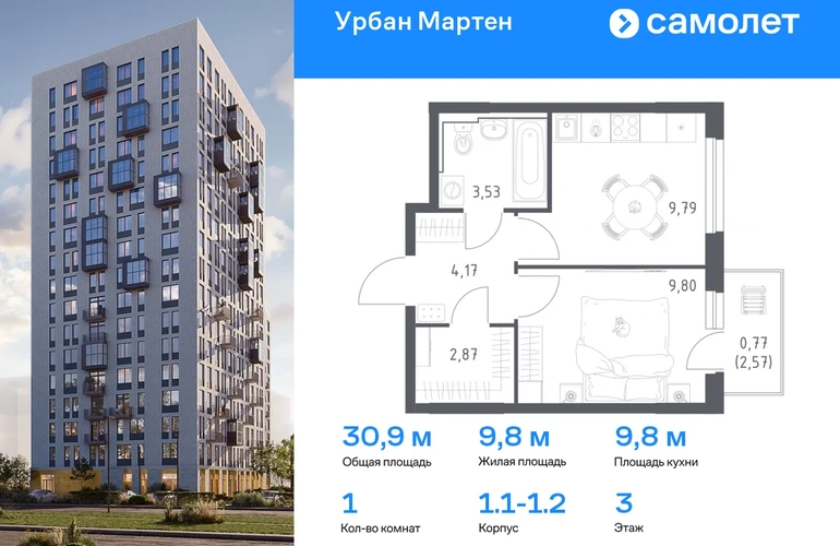 Предлагается 1-комнатная квартира комфорт-класса 30,93 кв.м в корпусе 1.1-1.2 на 3 этаже, в ЖК "Урбан Мартен" Квартира с чистовой отделкой. Доступность дополнительных опций уточняйте у застройщика. Планировкой предусмотрены: Прихожая - 4,17 м² Кухня - 9,79 м² Жилая_комната_1 - 9,8 м² Су_1 - 3,53 м² Гардероб - 2,87 м² Балкон_1 - 0,77 м² Приобрести квартиру возможно по специальным акциям от застройщика, с текущими условиями акций можно ознакомиться в блоке “Акций”. Цена динамическая и может отличаться, уточняйте актуальность у застройщика. В жилом комплексе «Урбан Мартен» у вас будет собственная Уфа: домашняя, неторопливая, теплая. Здесь дети будут играть во дворе без машин в догонялки, собака сможет бегать за палкой по пляжу, а с соседями получится встречаться не только у лифта, но и на утренних занятиях йогой на зеленой лужайке рядом с домом. Жилой комплекс «Урбан Мартен» находится в Демском районе — самом тихом и зеленом в Уфе. Здесь можно открывать окна нараспашку, чтобы квартира наполнялась свежим воздухом, и наблюдать с балкона, как покачиваются макушки деревьев. #yan19-2r1754914#О застройщике