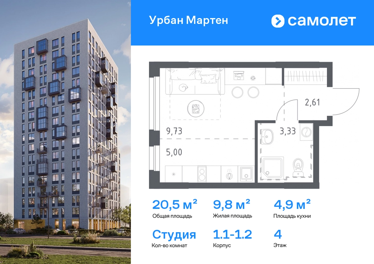 Предлагается квартира студия комфорт-класса 20,5 кв.м в корпусе 1.1-1.2 на 4 этаже, в ЖК «Урбан Мартен» Квартира с предчистовой отделкой. Доступность дополнительных опций уточняйте у застройщика. Приобрести квартиру возможно по специальным акциям от застройщика, с текущими условиями акций можно ознакомиться в блоке «Акций». Цена динамическая и может отличаться, уточняйте актуальность у застройщика. В жилом комплексе «Урбан Мартен» у вас будет собственная Уфа: домашняя, неторопливая, теплая. Здесь дети будут играть во дворе без машин в догонялки, собака сможет бегать за палкой по пляжу, а с соседями получится встречаться не только у лифта, но и на утренних занятиях йогой на зеленой лужайке рядом с домом. Жилой комплекс «Урбан Мартен» находится в Демском районе — самом тихом и зеленом в Уфе. Здесь можно открывать окна нараспашку, чтобы квартира наполнялась свежим воздухом, и наблюдать с балкона, как покачиваются макушки деревьев. #yan19-2r1754919#О застройщике