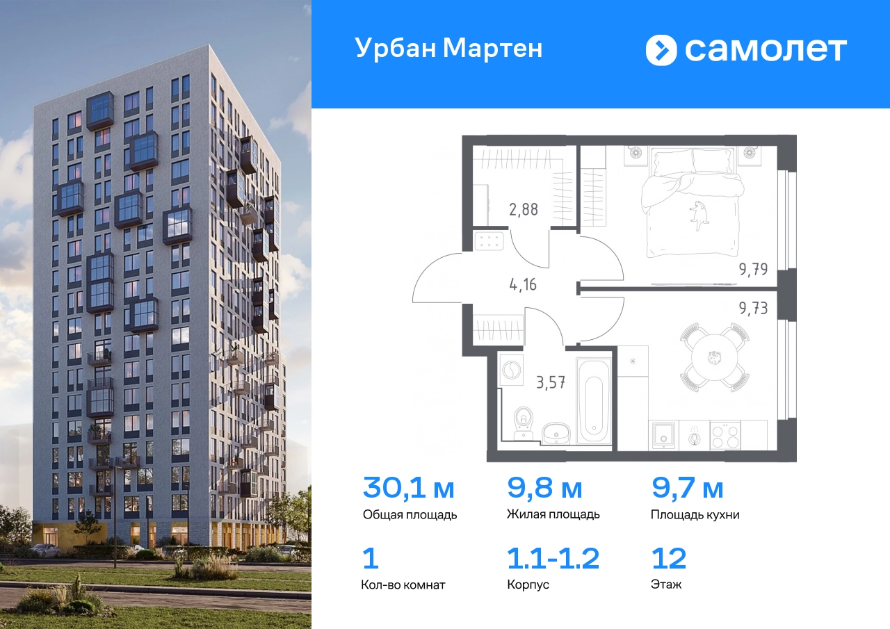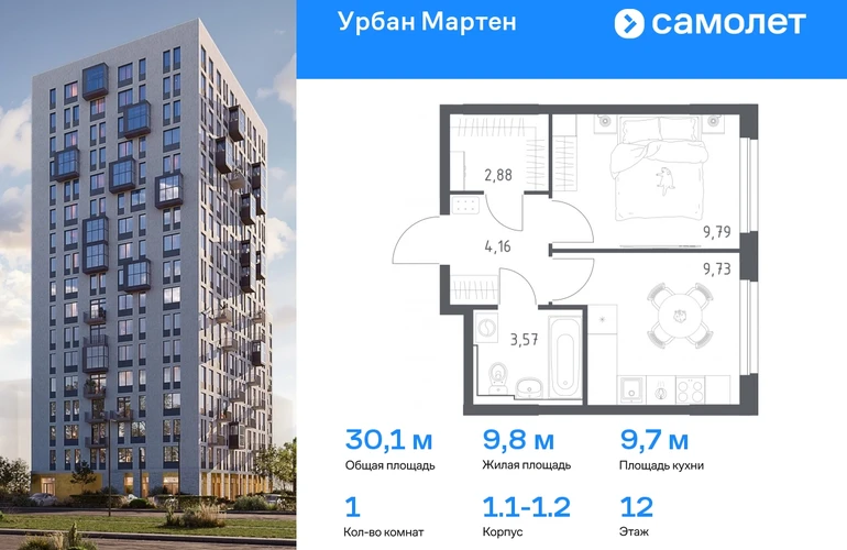 Предлагается 1-комнатная квартира комфорт-класса 30,13 кв.м в корпусе 1.1-1.2 на 12 этаже, в ЖК "Урбан Мартен" Квартира с чистовой отделкой. Доступность дополнительных опций уточняйте у застройщика. Планировкой предусмотрены: Прихожая - 4,16 м² Кухня - 9,73 м² Жилая_комната_1 - 9,79 м² Су_1 - 3,57 м² Гардероб - 2,88 м² Приобрести квартиру возможно по специальным акциям от застройщика, с текущими условиями акций можно ознакомиться в блоке “Акций”. Цена динамическая и может отличаться, уточняйте актуальность у застройщика. В жилом комплексе «Урбан Мартен» у вас будет собственная Уфа: домашняя, неторопливая, теплая. Здесь дети будут играть во дворе без машин в догонялки, собака сможет бегать за палкой по пляжу, а с соседями получится встречаться не только у лифта, но и на утренних занятиях йогой на зеленой лужайке рядом с домом. Жилой комплекс «Урбан Мартен» находится в Демском районе — самом тихом и зеленом в Уфе. Здесь можно открывать окна нараспашку, чтобы квартира наполнялась свежим воздухом, и наблюдать с балкона, как покачиваются макушки деревьев. #yan19-2r1756199#О застройщике