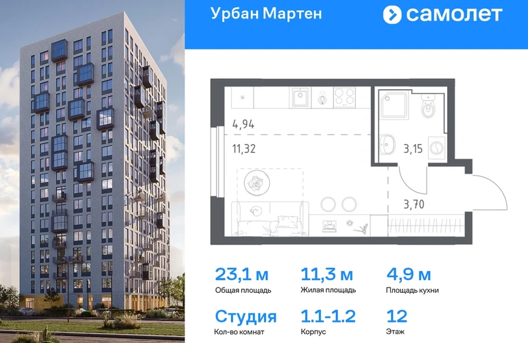Предлагается квартира студия комфорт-класса 23,11 кв.м в корпусе 1.1-1.2 на 12 этаже, в ЖК «Урбан Мартен» Квартира с чистовой отделкой. Доступность дополнительных опций уточняйте у застройщика. Приобрести квартиру возможно по специальным акциям от застройщика, с текущими условиями акций можно ознакомиться в блоке “Акций”. Цена динамическая и может отличаться, уточняйте актуальность у застройщика. В жилом комплексе «Урбан Мартен» у вас будет собственная Уфа: домашняя, неторопливая, теплая. Здесь дети будут играть во дворе без машин в догонялки, собака сможет бегать за палкой по пляжу, а с соседями получится встречаться не только у лифта, но и на утренних занятиях йогой на зеленой лужайке рядом с домом. Жилой комплекс «Урбан Мартен» находится в Демском районе — самом тихом и зеленом в Уфе. Здесь можно открывать окна нараспашку, чтобы квартира наполнялась свежим воздухом, и наблюдать с балкона, как покачиваются макушки деревьев. #yan19-2r1758317#О застройщике