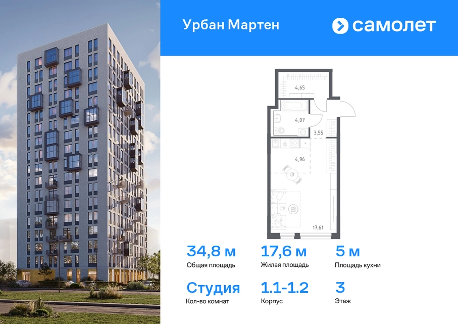 Строим кварталы для жизни с заботой о будущем. Предлагается квартира студия комфорт-класса 35 кв.м в корпусе 1.1-1.2 на 3 этаже, в ЖК «Урбан Мартен» Квартира с предчистовой отделкой. Доступность дополнительных опций уточняйте у застройщика. Приобрести квартиру возможно по специальным акциям от застройщика, с текущими условиями акций можно ознакомиться в блоке «Акций». Цена динамическая и может отличаться, уточняйте актуальность у застройщика. В жилом комплексе «Урбан Мартен» у вас будет собственная Уфа: домашняя, неторопливая, теплая. Здесь дети будут играть во дворе без машин в догонялки, собака сможет бегать за палкой по пляжу, а с соседями получится встречаться не только у лифта, но и на утренних занятиях йогой на зеленой лужайке рядом с домом. Жилой комплекс «Урбан Мартен» находится в Демском районе — самом тихом и зеленом в Уфе. Здесь можно открывать окна нараспашку, чтобы квартира наполнялась свежим воздухом, и наблюдать с балкона, как покачиваются макушки деревьев. #yan19-2r1758329#О застройщике