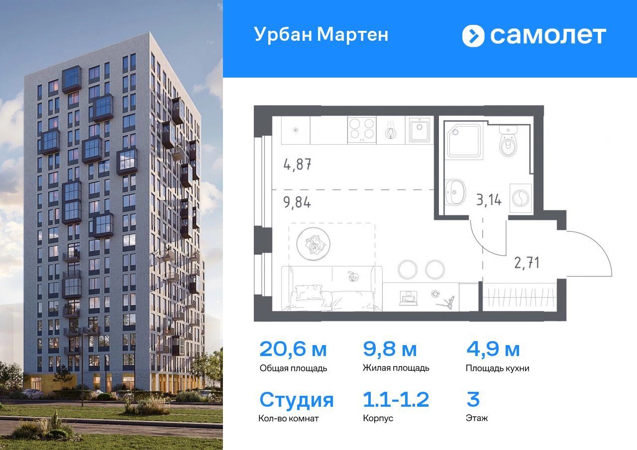 Предлагается квартира студия комфорт-класса 20,56 кв.м в корпусе 1.1-1.2 на 3 этаже, в ЖК «Урбан Мартен» Квартира с предчистовой отделкой. Доступность дополнительных опций уточняйте у застройщика. Приобрести квартиру возможно по специальным акциям от застройщика, с текущими условиями акций можно ознакомиться в блоке «Акций». Цена динамическая и может отличаться, уточняйте актуальность у застройщика. В жилом комплексе «Урбан Мартен» у вас будет собственная Уфа: домашняя, неторопливая, теплая. Здесь дети будут играть во дворе без машин в догонялки, собака сможет бегать за палкой по пляжу, а с соседями получится встречаться не только у лифта, но и на утренних занятиях йогой на зеленой лужайке рядом с домом. Жилой комплекс «Урбан Мартен» находится в Демском районе — самом тихом и зеленом в Уфе. Здесь можно открывать окна нараспашку, чтобы квартира наполнялась свежим воздухом, и наблюдать с балкона, как покачиваются макушки деревьев. #yan19-2r1758332#О застройщике