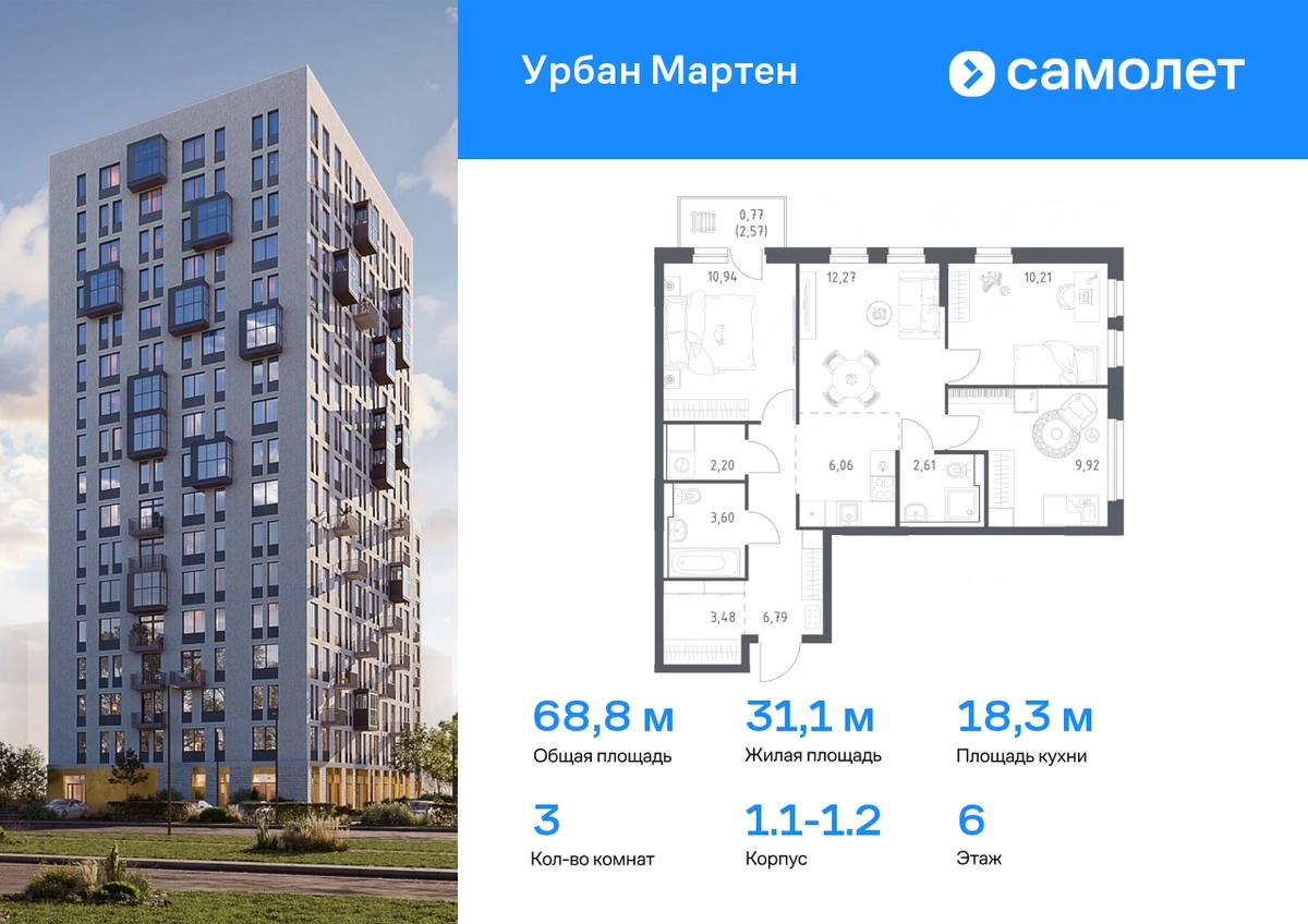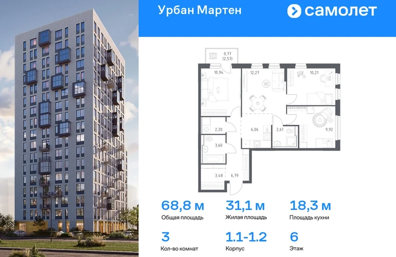 Строим кварталы для жизни с заботой о будущем. Предлагается 3-комнатная квартира комфорт-класса 69,7 кв.м в корпусе 1.1-1.2 на 6 этаже, в ЖК «Урбан Мартен» Квартира с предчистовой отделкой. Доступность дополнительных опций уточняйте у застройщика. Приобрести квартиру возможно по специальным акциям от застройщика, с текущими условиями акций можно ознакомиться в блоке «Акций». Цена динамическая и может отличаться, уточняйте актуальность у застройщика. В жилом комплексе «Урбан Мартен» у вас будет собственная Уфа: домашняя, неторопливая, теплая. Здесь дети будут играть во дворе без машин в догонялки, собака сможет бегать за палкой по пляжу, а с соседями получится встречаться не только у лифта, но и на утренних занятиях йогой на зеленой лужайке рядом с домом. Жилой комплекс «Урбан Мартен» находится в Демском районе — самом тихом и зеленом в Уфе. Здесь можно открывать окна нараспашку, чтобы квартира наполнялась свежим воздухом, и наблюдать с балкона, как покачиваются макушки деревьев. #yan19-2r1758339#О застройщике