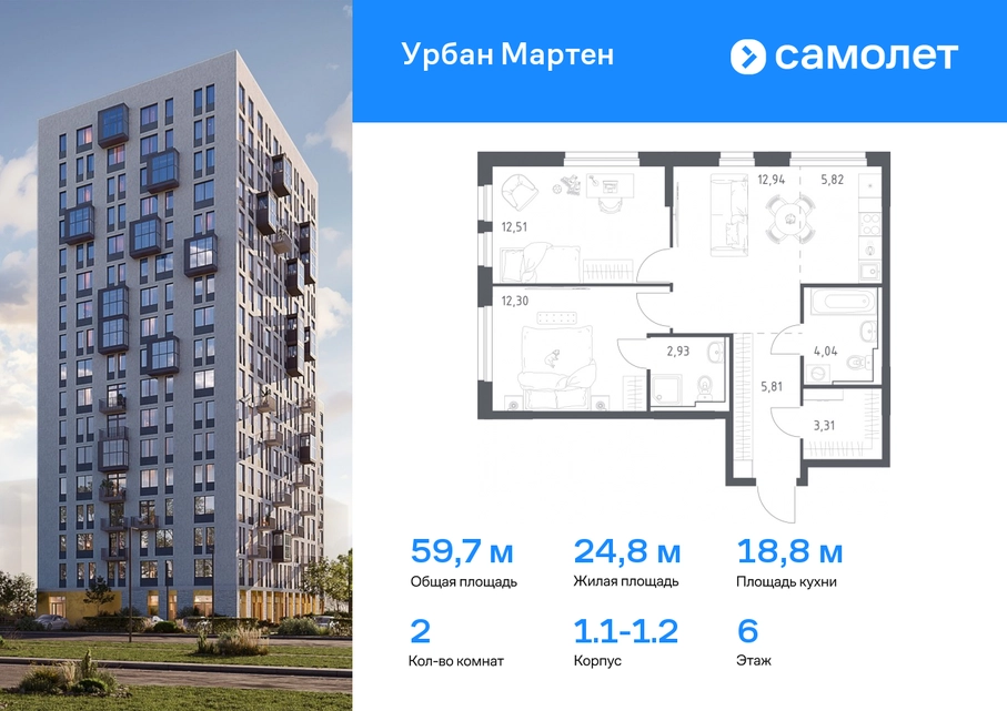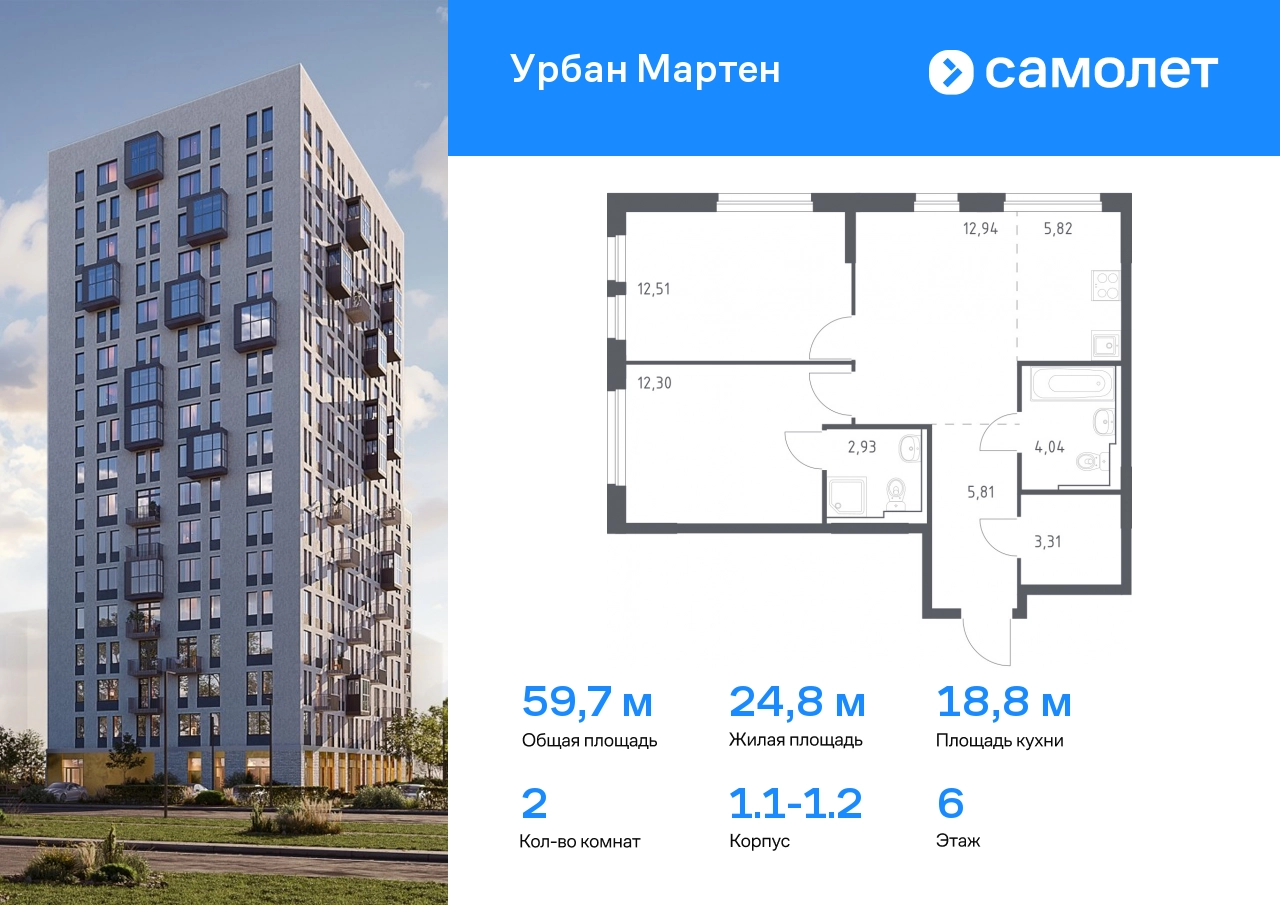 Строим кварталы для жизни с заботой о будущем. Предлагается 2-комнатная квартира комфорт-класса 59,93 кв.м в корпусе 1.1-1.2 на 6 этаже, в ЖК «Урбан Мартен» Квартира с предчистовой отделкой. Доступность дополнительных опций уточняйте у застройщика. Приобрести квартиру возможно по специальным акциям от застройщика, с текущими условиями акций можно ознакомиться в блоке «Акций». Цена динамическая и может отличаться, уточняйте актуальность у застройщика. В жилом комплексе «Урбан Мартен» у вас будет собственная Уфа: домашняя, неторопливая, теплая. Здесь дети будут играть во дворе без машин в догонялки, собака сможет бегать за палкой по пляжу, а с соседями получится встречаться не только у лифта, но и на утренних занятиях йогой на зеленой лужайке рядом с домом. Жилой комплекс «Урбан Мартен» находится в Демском районе — самом тихом и зеленом в Уфе. Здесь можно открывать окна нараспашку, чтобы квартира наполнялась свежим воздухом, и наблюдать с балкона, как покачиваются макушки деревьев. #yan19-2r1758343#О застройщике