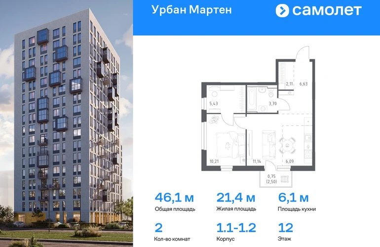 Строим кварталы для жизни с заботой о будущем. Предлагается 2-комнатная квартира комфорт-класса 46,16 кв.м в корпусе 1.1-1.2 на 12 этаже, в ЖК «Урбан Мартен» Квартира с предчистовой отделкой. Доступность дополнительных опций уточняйте у застройщика. Приобрести квартиру возможно по специальным акциям от застройщика, с текущими условиями акций можно ознакомиться в блоке «Акций». Цена динамическая и может отличаться, уточняйте актуальность у застройщика. В жилом комплексе «Урбан Мартен» у вас будет собственная Уфа: домашняя, неторопливая, теплая. Здесь дети будут играть во дворе без машин в догонялки, собака сможет бегать за палкой по пляжу, а с соседями получится встречаться не только у лифта, но и на утренних занятиях йогой на зеленой лужайке рядом с домом. Жилой комплекс «Урбан Мартен» находится в Демском районе — самом тихом и зеленом в Уфе. Здесь можно открывать окна нараспашку, чтобы квартира наполнялась свежим воздухом, и наблюдать с балкона, как покачиваются макушки деревьев. #yan19-2r1758349#О застройщике