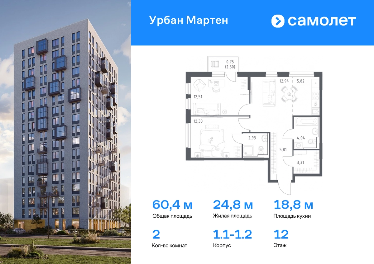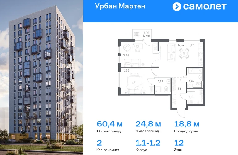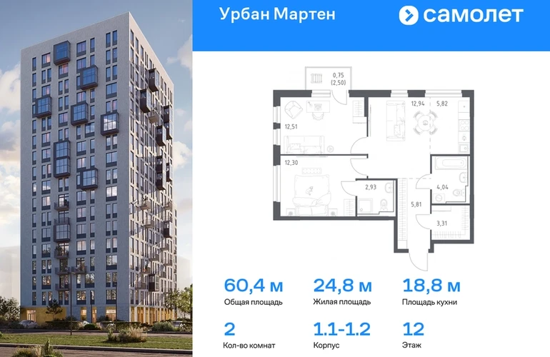 Строим кварталы для жизни с заботой о будущем. Предлагается 2-комнатная квартира комфорт-класса 60,67 кв.м в корпусе 1.1-1.2 на 12 этаже, в ЖК «Урбан Мартен» Квартира с предчистовой отделкой. Доступность дополнительных опций уточняйте у застройщика. Приобрести квартиру возможно по специальным акциям от застройщика, с текущими условиями акций можно ознакомиться в блоке «Акций». Цена динамическая и может отличаться, уточняйте актуальность у застройщика. В жилом комплексе «Урбан Мартен» у вас будет собственная Уфа: домашняя, неторопливая, теплая. Здесь дети будут играть во дворе без машин в догонялки, собака сможет бегать за палкой по пляжу, а с соседями получится встречаться не только у лифта, но и на утренних занятиях йогой на зеленой лужайке рядом с домом. Жилой комплекс «Урбан Мартен» находится в Демском районе — самом тихом и зеленом в Уфе. Здесь можно открывать окна нараспашку, чтобы квартира наполнялась свежим воздухом, и наблюдать с балкона, как покачиваются макушки деревьев. #yan19-2r1758353#О застройщике