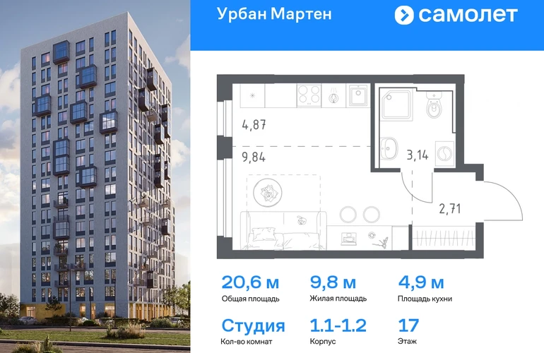 Строим кварталы для жизни с заботой о будущем. Предлагается квартира студия комфорт-класса 20,7 кв.м в корпусе 1.1-1.2 на 17 этаже, в ЖК «Урбан Мартен» Квартира с предчистовой отделкой. Доступность дополнительных опций уточняйте у застройщика. Приобрести квартиру возможно по специальным акциям от застройщика, с текущими условиями акций можно ознакомиться в блоке «Акций». Цена динамическая и может отличаться, уточняйте актуальность у застройщика. В жилом комплексе «Урбан Мартен» у вас будет собственная Уфа: домашняя, неторопливая, теплая. Здесь дети будут играть во дворе без машин в догонялки, собака сможет бегать за палкой по пляжу, а с соседями получится встречаться не только у лифта, но и на утренних занятиях йогой на зеленой лужайке рядом с домом. Жилой комплекс «Урбан Мартен» находится в Демском районе — самом тихом и зеленом в Уфе. Здесь можно открывать окна нараспашку, чтобы квартира наполнялась свежим воздухом, и наблюдать с балкона, как покачиваются макушки деревьев. #yan19-2r1758361#О застройщике