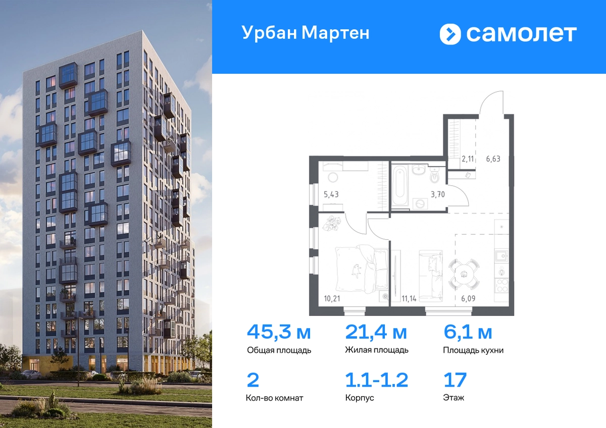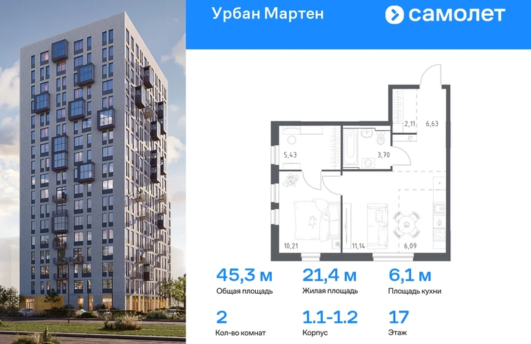 Строим кварталы для жизни с заботой о будущем. Предлагается 2-комнатная квартира комфорт-класса 45,42 кв.м в корпусе 1.1-1.2 на 17 этаже, в ЖК «Урбан Мартен» Квартира с предчистовой отделкой. Доступность дополнительных опций уточняйте у застройщика. Приобрести квартиру возможно по специальным акциям от застройщика, с текущими условиями акций можно ознакомиться в блоке «Акций». Цена динамическая и может отличаться, уточняйте актуальность у застройщика. В жилом комплексе «Урбан Мартен» у вас будет собственная Уфа: домашняя, неторопливая, теплая. Здесь дети будут играть во дворе без машин в догонялки, собака сможет бегать за палкой по пляжу, а с соседями получится встречаться не только у лифта, но и на утренних занятиях йогой на зеленой лужайке рядом с домом. Жилой комплекс «Урбан Мартен» находится в Демском районе — самом тихом и зеленом в Уфе. Здесь можно открывать окна нараспашку, чтобы квартира наполнялась свежим воздухом, и наблюдать с балкона, как покачиваются макушки деревьев. #yan19-2r1758368#О застройщике