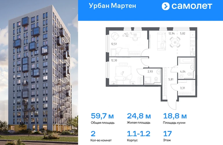 Строим кварталы для жизни с заботой о будущем. Предлагается 2-комнатная квартира комфорт-класса 59,93 кв.м в корпусе 1.1-1.2 на 17 этаже, в ЖК «Урбан Мартен» Квартира с предчистовой отделкой. Доступность дополнительных опций уточняйте у застройщика. Приобрести квартиру возможно по специальным акциям от застройщика, с текущими условиями акций можно ознакомиться в блоке «Акций». Цена динамическая и может отличаться, уточняйте актуальность у застройщика. В жилом комплексе «Урбан Мартен» у вас будет собственная Уфа: домашняя, неторопливая, теплая. Здесь дети будут играть во дворе без машин в догонялки, собака сможет бегать за палкой по пляжу, а с соседями получится встречаться не только у лифта, но и на утренних занятиях йогой на зеленой лужайке рядом с домом. Жилой комплекс «Урбан Мартен» находится в Демском районе — самом тихом и зеленом в Уфе. Здесь можно открывать окна нараспашку, чтобы квартира наполнялась свежим воздухом, и наблюдать с балкона, как покачиваются макушки деревьев. #yan19-2r1758369#О застройщике