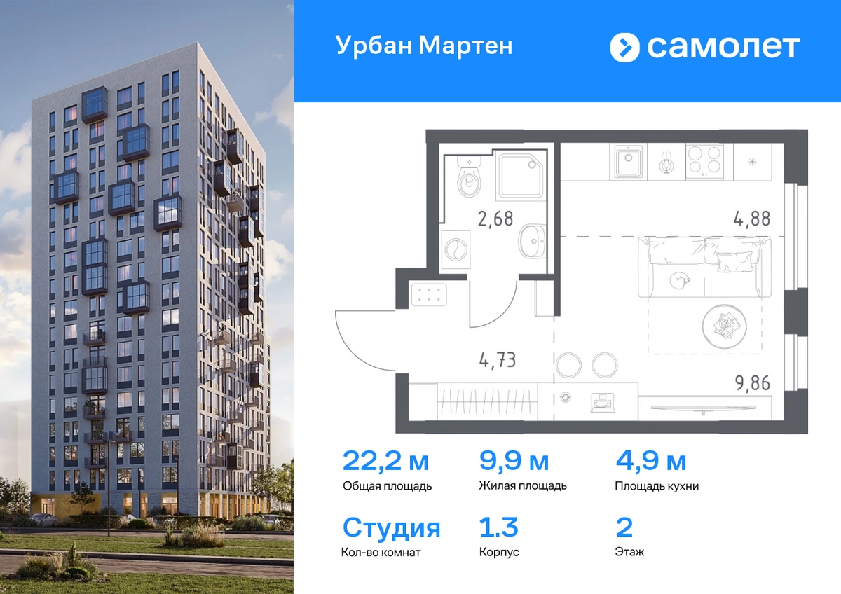 Строим кварталы для жизни с заботой о будущем. Предлагается квартира студия комфорт-класса 22,5 кв.м в корпусе 1.3 на 2 этаже, в ЖК «Урбан Мартен» Квартира с предчистовой отделкой. Доступность дополнительных опций уточняйте у застройщика. Приобрести квартиру возможно по специальным акциям от застройщика, с текущими условиями акций можно ознакомиться в блоке «Акций». Цена динамическая и может отличаться, уточняйте актуальность у застройщика. В жилом комплексе «Урбан Мартен» у вас будет собственная Уфа: домашняя, неторопливая, теплая. Здесь дети будут играть во дворе без машин в догонялки, собака сможет бегать за палкой по пляжу, а с соседями получится встречаться не только у лифта, но и на утренних занятиях йогой на зеленой лужайке рядом с домом. Жилой комплекс «Урбан Мартен» находится в Демском районе — самом тихом и зеленом в Уфе. Здесь можно открывать окна нараспашку, чтобы квартира наполнялась свежим воздухом, и наблюдать с балкона, как покачиваются макушки деревьев. #yan19-2r1758381#О застройщике