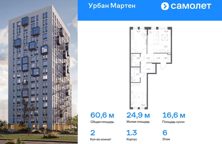 Строим кварталы для жизни с заботой о будущем. Предлагается 2-комнатная квартира комфорт-класса 60,93 кв.м в корпусе 1.3 на 6 этаже, в ЖК «Урбан Мартен» Квартира с предчистовой отделкой. Доступность дополнительных опций уточняйте у застройщика. Приобрести квартиру возможно по специальным акциям от застройщика, с текущими условиями акций можно ознакомиться в блоке «Акций». Цена динамическая и может отличаться, уточняйте актуальность у застройщика. В жилом комплексе «Урбан Мартен» у вас будет собственная Уфа: домашняя, неторопливая, теплая. Здесь дети будут играть во дворе без машин в догонялки, собака сможет бегать за палкой по пляжу, а с соседями получится встречаться не только у лифта, но и на утренних занятиях йогой на зеленой лужайке рядом с домом. Жилой комплекс «Урбан Мартен» находится в Демском районе — самом тихом и зеленом в Уфе. Здесь можно открывать окна нараспашку, чтобы квартира наполнялась свежим воздухом, и наблюдать с балкона, как покачиваются макушки деревьев. #yan19-2r1758387#О застройщике