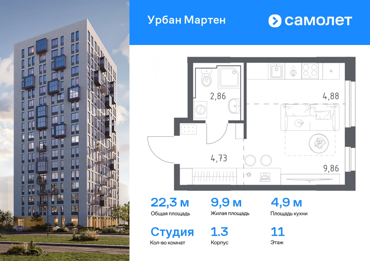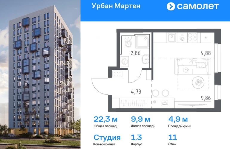 Строим кварталы для жизни с заботой о будущем. Предлагается квартира студия комфорт-класса 22,5 кв.м в корпусе 1.3 на 11 этаже, в ЖК «Урбан Мартен» Квартира с предчистовой отделкой. Доступность дополнительных опций уточняйте у застройщика. Приобрести квартиру возможно по специальным акциям от застройщика, с текущими условиями акций можно ознакомиться в блоке «Акций». Цена динамическая и может отличаться, уточняйте актуальность у застройщика. В жилом комплексе «Урбан Мартен» у вас будет собственная Уфа: домашняя, неторопливая, теплая. Здесь дети будут играть во дворе без машин в догонялки, собака сможет бегать за палкой по пляжу, а с соседями получится встречаться не только у лифта, но и на утренних занятиях йогой на зеленой лужайке рядом с домом. Жилой комплекс «Урбан Мартен» находится в Демском районе — самом тихом и зеленом в Уфе. Здесь можно открывать окна нараспашку, чтобы квартира наполнялась свежим воздухом, и наблюдать с балкона, как покачиваются макушки деревьев. #yan19-2r1758397#О застройщике
