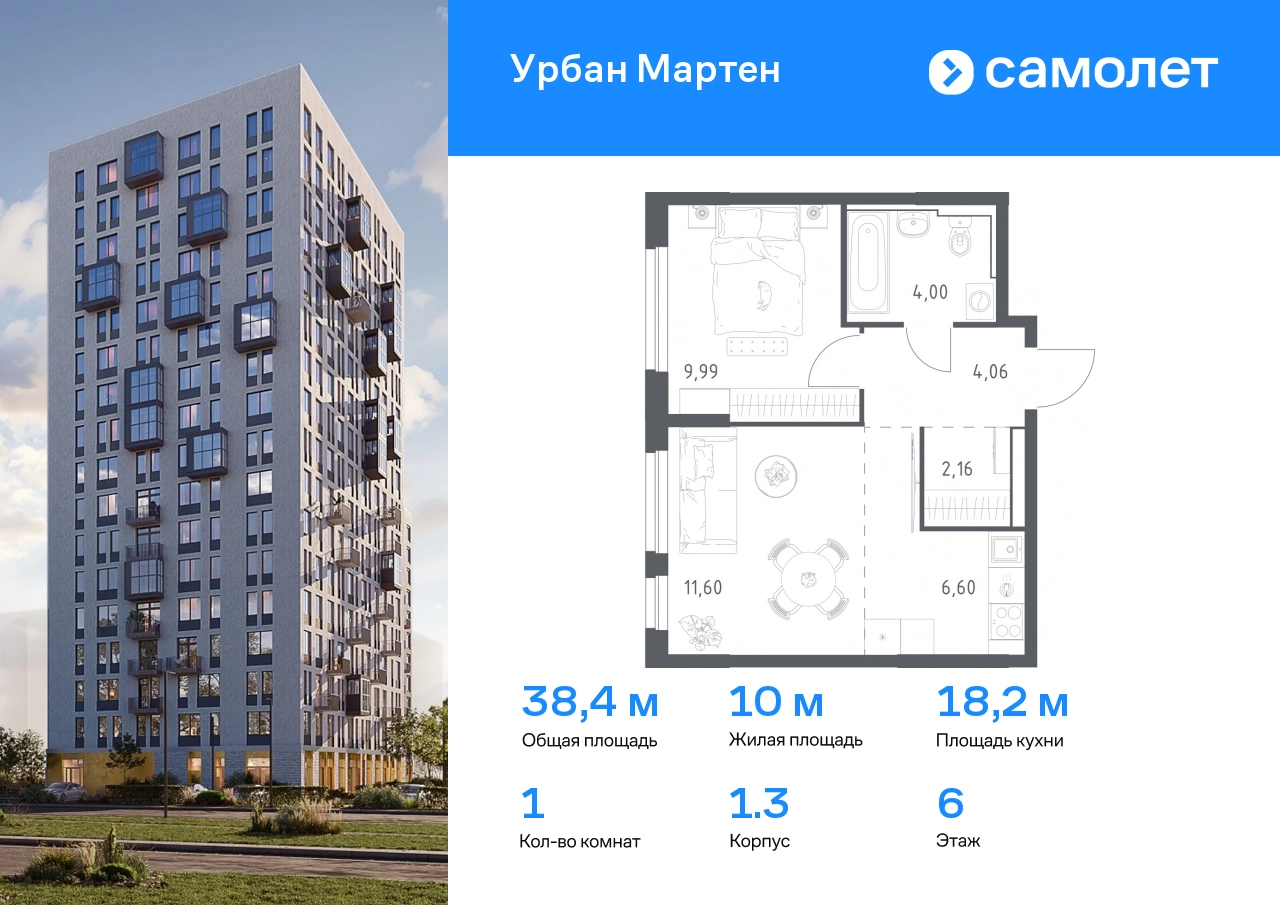 Предлагается 1-комнатная квартира комфорт-класса 38,41 кв.м в корпусе 1.3 на 6 этаже, в ЖК «Урбан Мартен» Квартира с предчистовой отделкой. Доступность дополнительных опций уточняйте у застройщика. Приобрести квартиру возможно по специальным акциям от застройщика, с текущими условиями акций можно ознакомиться в блоке “Акций”. Цена динамическая и может отличаться, уточняйте актуальность у застройщика. В жилом комплексе «Урбан Мартен» у вас будет собственная Уфа: домашняя, неторопливая, теплая. Здесь дети будут играть во дворе без машин в догонялки, собака сможет бегать за палкой по пляжу, а с соседями получится встречаться не только у лифта, но и на утренних занятиях йогой на зеленой лужайке рядом с домом. Жилой комплекс «Урбан Мартен» находится в Демском районе — самом тихом и зеленом в Уфе. Здесь можно открывать окна нараспашку, чтобы квартира наполнялась свежим воздухом, и наблюдать с балкона, как покачиваются макушки деревьев. #yan19-2r1758417#О застройщике