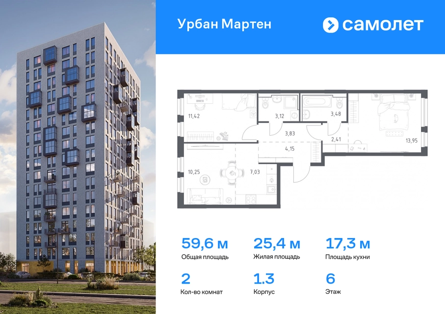 Строим кварталы для жизни с заботой о будущем. Предлагается 2-комнатная квартира комфорт-класса 59,88 кв.м в корпусе 1.3 на 6 этаже, в ЖК «Урбан Мартен» Квартира с предчистовой отделкой. Доступность дополнительных опций уточняйте у застройщика. Приобрести квартиру возможно по специальным акциям от застройщика, с текущими условиями акций можно ознакомиться в блоке «Акций». Цена динамическая и может отличаться, уточняйте актуальность у застройщика. В жилом комплексе «Урбан Мартен» у вас будет собственная Уфа: домашняя, неторопливая, теплая. Здесь дети будут играть во дворе без машин в догонялки, собака сможет бегать за палкой по пляжу, а с соседями получится встречаться не только у лифта, но и на утренних занятиях йогой на зеленой лужайке рядом с домом. Жилой комплекс «Урбан Мартен» находится в Демском районе — самом тихом и зеленом в Уфе. Здесь можно открывать окна нараспашку, чтобы квартира наполнялась свежим воздухом, и наблюдать с балкона, как покачиваются макушки деревьев. #yan19-2r1758422#О застройщике