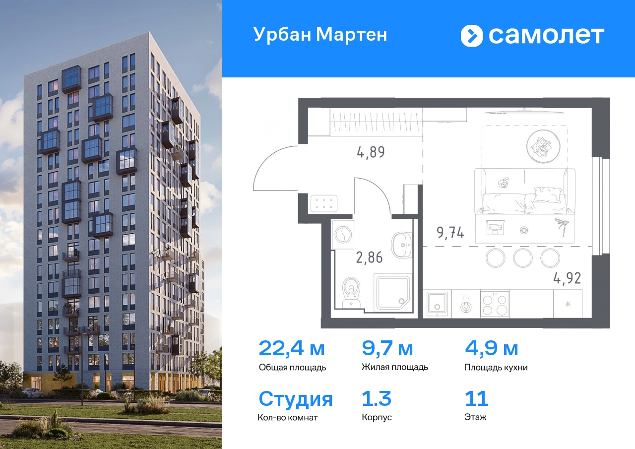 Предлагается квартира студия комфорт-класса 22,41 кв.м в корпусе 1.3 на 11 этаже, в ЖК «Урбан Мартен» Квартира с предчистовой отделкой. Доступность дополнительных опций уточняйте у застройщика. Приобрести квартиру возможно по специальным акциям от застройщика, с текущими условиями акций можно ознакомиться в блоке «Акций». Цена динамическая и может отличаться, уточняйте актуальность у застройщика. В жилом комплексе «Урбан Мартен» у вас будет собственная Уфа: домашняя, неторопливая, теплая. Здесь дети будут играть во дворе без машин в догонялки, собака сможет бегать за палкой по пляжу, а с соседями получится встречаться не только у лифта, но и на утренних занятиях йогой на зеленой лужайке рядом с домом. Жилой комплекс «Урбан Мартен» находится в Демском районе — самом тихом и зеленом в Уфе. Здесь можно открывать окна нараспашку, чтобы квартира наполнялась свежим воздухом, и наблюдать с балкона, как покачиваются макушки деревьев. #yan19-2r1758431#О застройщике
