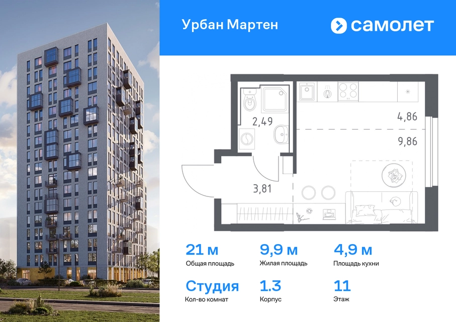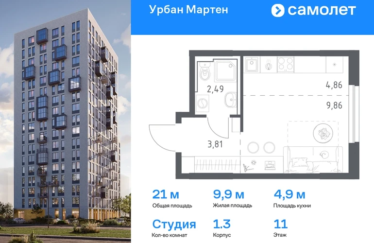 Предлагается квартира студия комфорт-класса 21,02 кв.м в корпусе 1.3 на 11 этаже, в ЖК «Урбан Мартен» Квартира с предчистовой отделкой. Доступность дополнительных опций уточняйте у застройщика. Приобрести квартиру возможно по специальным акциям от застройщика, с текущими условиями акций можно ознакомиться в блоке “Акций”. Цена динамическая и может отличаться, уточняйте актуальность у застройщика. В жилом комплексе «Урбан Мартен» у вас будет собственная Уфа: домашняя, неторопливая, теплая. Здесь дети будут играть во дворе без машин в догонялки, собака сможет бегать за палкой по пляжу, а с соседями получится встречаться не только у лифта, но и на утренних занятиях йогой на зеленой лужайке рядом с домом. Жилой комплекс «Урбан Мартен» находится в Демском районе — самом тихом и зеленом в Уфе. Здесь можно открывать окна нараспашку, чтобы квартира наполнялась свежим воздухом, и наблюдать с балкона, как покачиваются макушки деревьев. #yan19-2r1758432#О застройщике