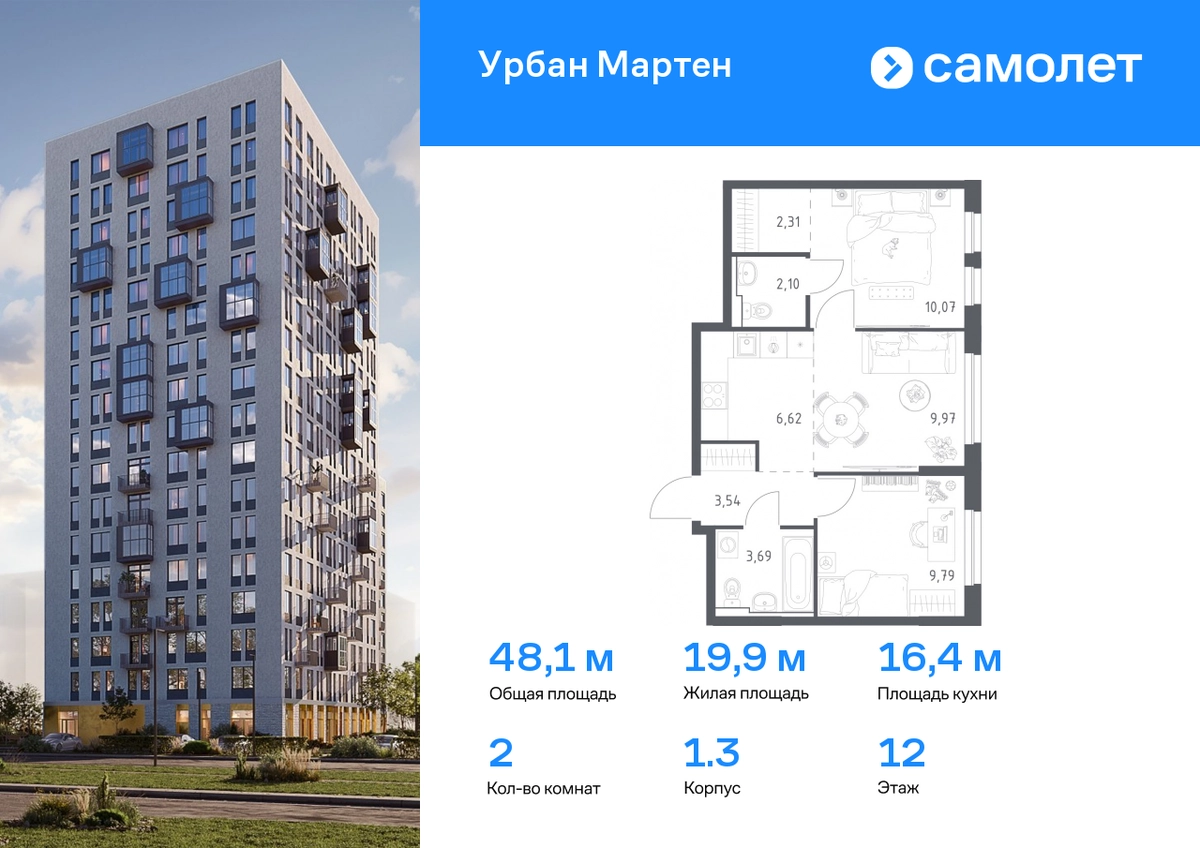 Предлагается 2-комнатная квартира комфорт-класса 48,09 кв.м в корпусе 1.3 на 12 этаже, в ЖК «Урбан Мартен» Квартира с предчистовой отделкой. Доступность дополнительных опций уточняйте у застройщика. Приобрести квартиру возможно по специальным акциям от застройщика, с текущими условиями акций можно ознакомиться в блоке “Акций”. Цена динамическая и может отличаться, уточняйте актуальность у застройщика. В жилом комплексе «Урбан Мартен» у вас будет собственная Уфа: домашняя, неторопливая, теплая. Здесь дети будут играть во дворе без машин в догонялки, собака сможет бегать за палкой по пляжу, а с соседями получится встречаться не только у лифта, но и на утренних занятиях йогой на зеленой лужайке рядом с домом. Жилой комплекс «Урбан Мартен» находится в Демском районе — самом тихом и зеленом в Уфе. Здесь можно открывать окна нараспашку, чтобы квартира наполнялась свежим воздухом, и наблюдать с балкона, как покачиваются макушки деревьев. #yan19-2r1758650#О застройщике