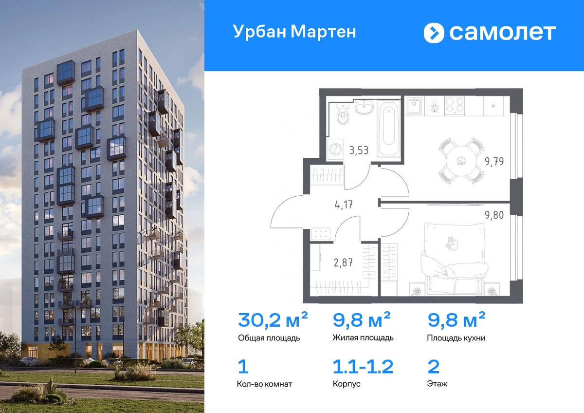 Предлагается 1-комнатная квартира комфорт-класса 30,16 кв.м в корпусе 1.1-1.2 на 2 этаже, в ЖК «Урбан Мартен» Квартира без отделки. Доступность опции "отделка" и возможность комплектации мебелью и декором уточняйте у застройщика. Приобрести квартиру возможно по специальным акциям от застройщика, с текущими условиями акций можно ознакомиться в блоке “Акций”. Цена динамическая и может отличаться, уточняйте актуальность у застройщика. В жилом комплексе «Урбан Мартен» у вас будет собственная Уфа: домашняя, неторопливая, теплая. Здесь дети будут играть во дворе без машин в догонялки, собака сможет бегать за палкой по пляжу, а с соседями получится встречаться не только у лифта, но и на утренних занятиях йогой на зеленой лужайке рядом с домом. Жилой комплекс «Урбан Мартен» находится в Демском районе — самом тихом и зеленом в Уфе. Здесь можно открывать окна нараспашку, чтобы квартира наполнялась свежим воздухом, и наблюдать с балкона, как покачиваются макушки деревьев. #yan19-2r1801087#О застройщике