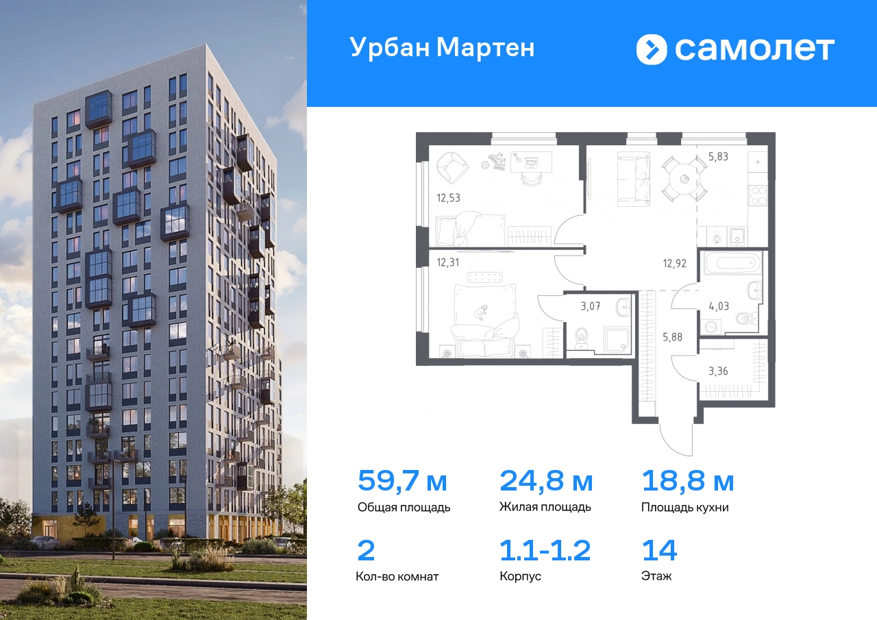 Строим кварталы для жизни с заботой о будущем. Предлагается 2-комнатная квартира комфорт-класса 59,93 кв.м в корпусе 1.1-1.2 на 14 этаже, в ЖК «Урбан Мартен» Квартира с предчистовой отделкой. Доступность дополнительных опций уточняйте у застройщика. Приобрести квартиру возможно по специальным акциям от застройщика, с текущими условиями акций можно ознакомиться в блоке «Акций». Цена динамическая и может отличаться, уточняйте актуальность у застройщика. В жилом комплексе «Урбан Мартен» у вас будет собственная Уфа: домашняя, неторопливая, теплая. Здесь дети будут играть во дворе без машин в догонялки, собака сможет бегать за палкой по пляжу, а с соседями получится встречаться не только у лифта, но и на утренних занятиях йогой на зеленой лужайке рядом с домом. Жилой комплекс «Урбан Мартен» находится в Демском районе — самом тихом и зеленом в Уфе. Здесь можно открывать окна нараспашку, чтобы квартира наполнялась свежим воздухом, и наблюдать с балкона, как покачиваются макушки деревьев. #yan19-2r1810414#О застройщике