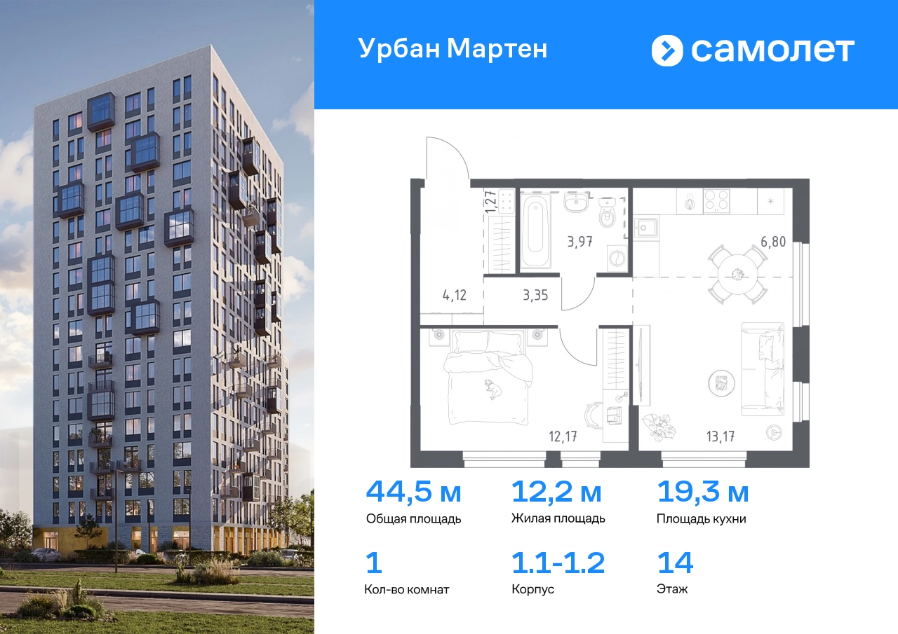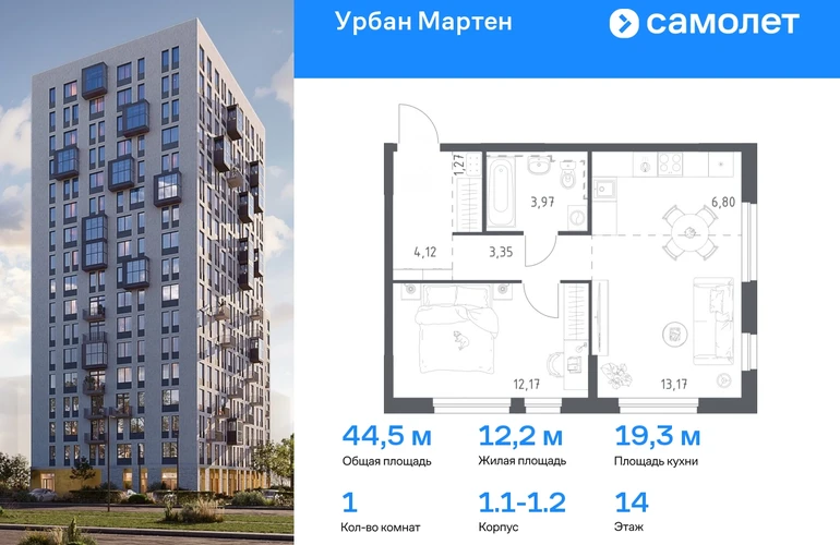 Строим кварталы для жизни с заботой о будущем. Предлагается 1-комнатная квартира комфорт-класса 44,85 кв.м в корпусе 1.1-1.2 на 14 этаже, в ЖК «Урбан Мартен» Квартира с предчистовой отделкой. Доступность дополнительных опций уточняйте у застройщика. Приобрести квартиру возможно по специальным акциям от застройщика, с текущими условиями акций можно ознакомиться в блоке «Акций». Цена динамическая и может отличаться, уточняйте актуальность у застройщика. В жилом комплексе «Урбан Мартен» у вас будет собственная Уфа: домашняя, неторопливая, теплая. Здесь дети будут играть во дворе без машин в догонялки, собака сможет бегать за палкой по пляжу, а с соседями получится встречаться не только у лифта, но и на утренних занятиях йогой на зеленой лужайке рядом с домом. Жилой комплекс «Урбан Мартен» находится в Демском районе — самом тихом и зеленом в Уфе. Здесь можно открывать окна нараспашку, чтобы квартира наполнялась свежим воздухом, и наблюдать с балкона, как покачиваются макушки деревьев. #yan19-2r1810415#О застройщике