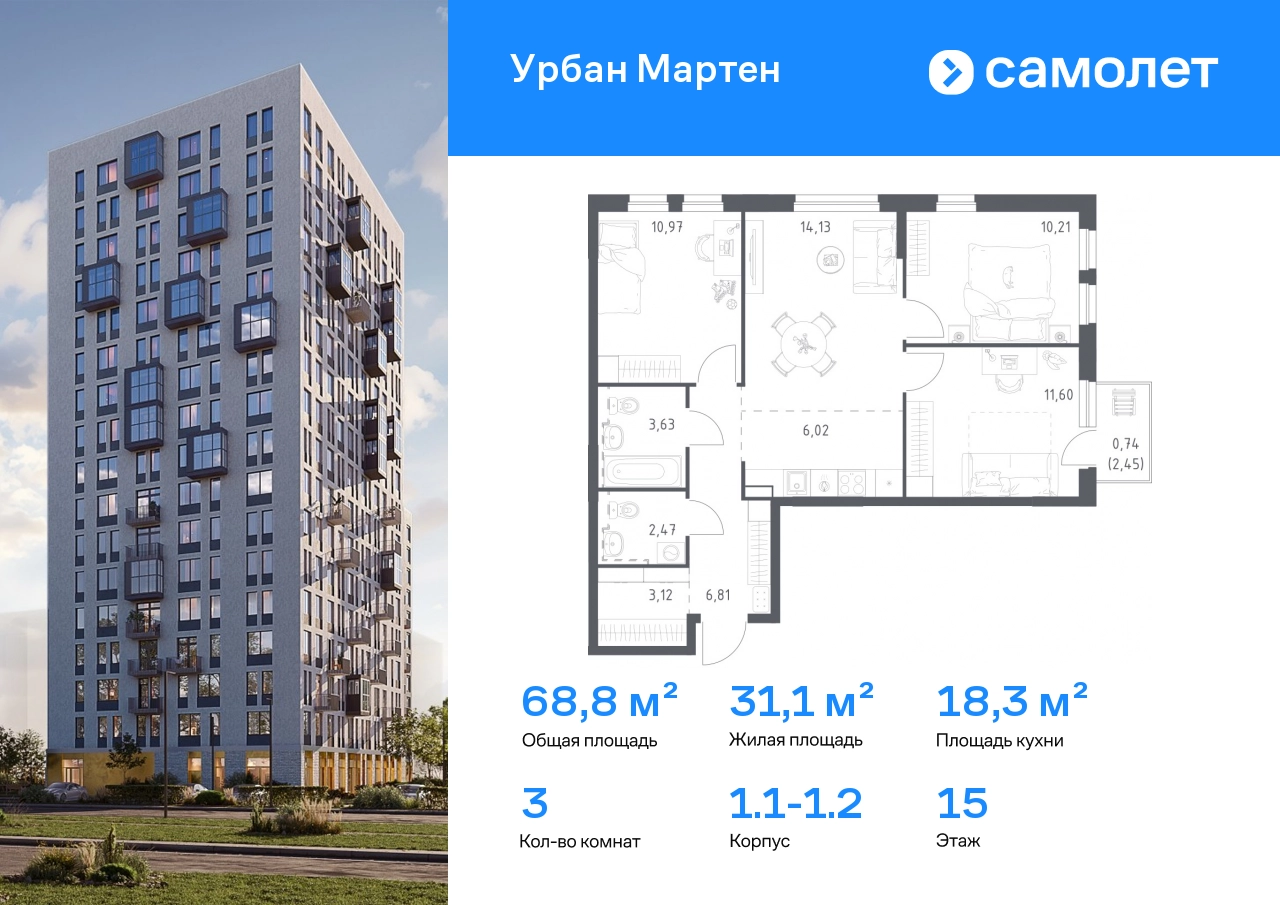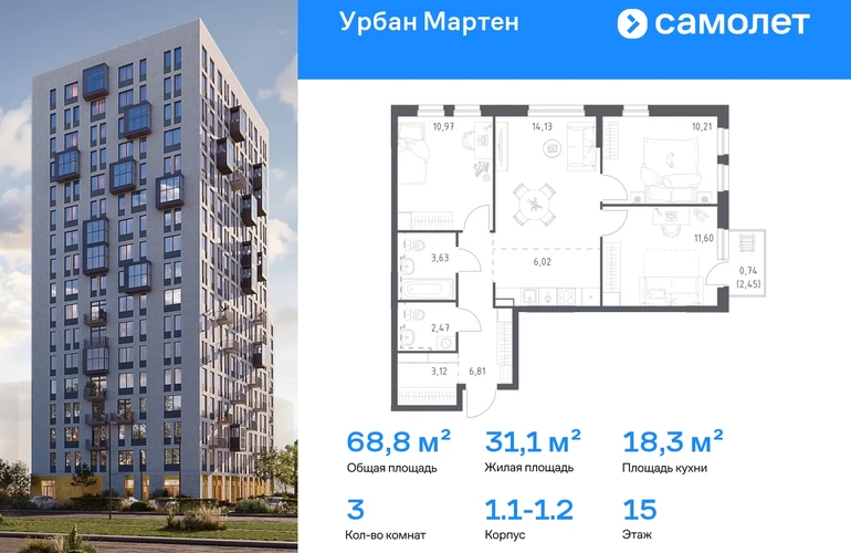 Строим кварталы для жизни с заботой о будущем. Предлагается 3-комнатная квартира комфорт-класса 69,7 кв.м в корпусе 1.1-1.2 на 15 этаже, в ЖК «Урбан Мартен» Квартира с предчистовой отделкой. Доступность дополнительных опций уточняйте у застройщика. Приобрести квартиру возможно по специальным акциям от застройщика, с текущими условиями акций можно ознакомиться в блоке «Акций». Цена динамическая и может отличаться, уточняйте актуальность у застройщика. В жилом комплексе «Урбан Мартен» у вас будет собственная Уфа: домашняя, неторопливая, теплая. Здесь дети будут играть во дворе без машин в догонялки, собака сможет бегать за палкой по пляжу, а с соседями получится встречаться не только у лифта, но и на утренних занятиях йогой на зеленой лужайке рядом с домом. Жилой комплекс «Урбан Мартен» находится в Демском районе — самом тихом и зеленом в Уфе. Здесь можно открывать окна нараспашку, чтобы квартира наполнялась свежим воздухом, и наблюдать с балкона, как покачиваются макушки деревьев. #yan19-2r1811120#О застройщике
