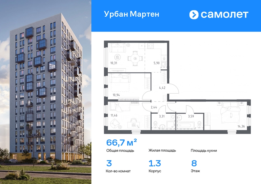 Строим кварталы для жизни с заботой о будущем. Предлагается 3-комнатная квартира комфорт-класса 66,73 кв.м в корпусе 1.3 на 8 этаже, в ЖК «Урбан Мартен» Квартира с предчистовой отделкой. Доступность дополнительных опций уточняйте у застройщика. Приобрести квартиру возможно по специальным акциям от застройщика, с текущими условиями акций можно ознакомиться в блоке «Акций». Цена динамическая и может отличаться, уточняйте актуальность у застройщика. В жилом комплексе «Урбан Мартен» у вас будет собственная Уфа: домашняя, неторопливая, теплая. Здесь дети будут играть во дворе без машин в догонялки, собака сможет бегать за палкой по пляжу, а с соседями получится встречаться не только у лифта, но и на утренних занятиях йогой на зеленой лужайке рядом с домом. Жилой комплекс «Урбан Мартен» находится в Демском районе — самом тихом и зеленом в Уфе. Здесь можно открывать окна нараспашку, чтобы квартира наполнялась свежим воздухом, и наблюдать с балкона, как покачиваются макушки деревьев. #yan19-2r1812263#О застройщике
