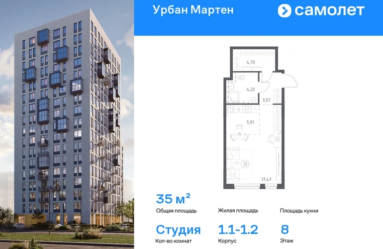 Строим кварталы для жизни с заботой о будущем. Предлагается квартира студия комфорт-класса 35 кв.м в корпусе 1.1-1.2 на 8 этаже, в ЖК «Урбан Мартен» Квартира с предчистовой отделкой. Доступность дополнительных опций уточняйте у застройщика. Приобрести квартиру возможно по специальным акциям от застройщика, с текущими условиями акций можно ознакомиться в блоке «Акций». Цена динамическая и может отличаться, уточняйте актуальность у застройщика. В жилом комплексе «Урбан Мартен» у вас будет собственная Уфа: домашняя, неторопливая, теплая. Здесь дети будут играть во дворе без машин в догонялки, собака сможет бегать за палкой по пляжу, а с соседями получится встречаться не только у лифта, но и на утренних занятиях йогой на зеленой лужайке рядом с домом. Жилой комплекс «Урбан Мартен» находится в Демском районе — самом тихом и зеленом в Уфе. Здесь можно открывать окна нараспашку, чтобы квартира наполнялась свежим воздухом, и наблюдать с балкона, как покачиваются макушки деревьев. #yan19-2r1812583#О застройщике