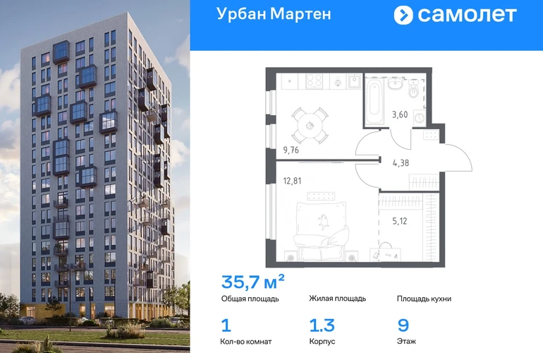 Предлагается 1-комнатная квартира комфорт-класса 35,67 кв.м в корпусе 1.3 на 9 этаже, в ЖК «Урбан Мартен» Квартира без отделки. Доступность опции «отделка» и возможность комплектации мебелью и декором уточняйте у застройщика. Приобрести квартиру возможно по специальным акциям от застройщика, с текущими условиями акций можно ознакомиться в блоке «Акций». Цена динамическая и может отличаться, уточняйте актуальность у застройщика. В жилом комплексе «Урбан Мартен» у вас будет собственная Уфа: домашняя, неторопливая, теплая. Здесь дети будут играть во дворе без машин в догонялки, собака сможет бегать за палкой по пляжу, а с соседями получится встречаться не только у лифта, но и на утренних занятиях йогой на зеленой лужайке рядом с домом. Жилой комплекс «Урбан Мартен» находится в Демском районе — самом тихом и зеленом в Уфе. Здесь можно открывать окна нараспашку, чтобы квартира наполнялась свежим воздухом, и наблюдать с балкона, как покачиваются макушки деревьев. #yan19-2r1813180#О застройщике
