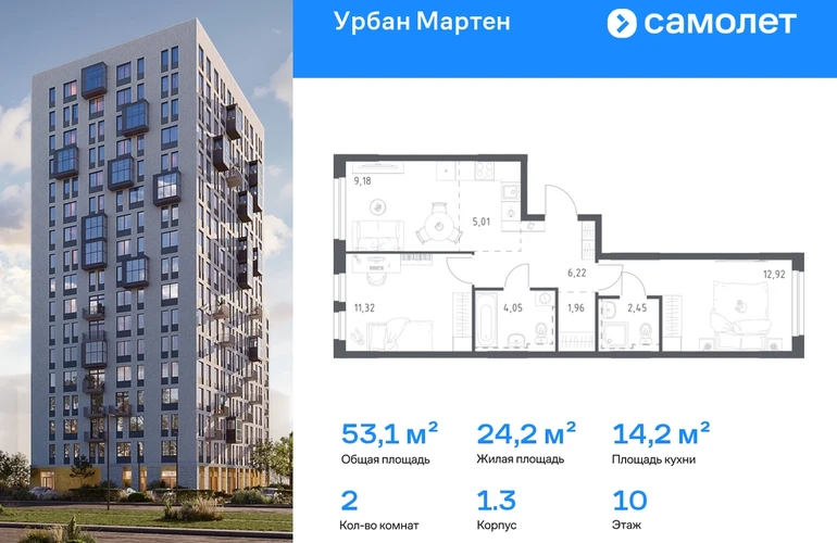 Предлагается 2-комнатная квартира комфорт-класса 53,11 кв.м в корпусе 1.3 на 10 этаже, в ЖК «Урбан Мартен» Квартира без отделки. Доступность опции «отделка» и возможность комплектации мебелью и декором уточняйте у застройщика. Приобрести квартиру возможно по специальным акциям от застройщика, с текущими условиями акций можно ознакомиться в блоке «Акций». Цена динамическая и может отличаться, уточняйте актуальность у застройщика. В жилом комплексе «Урбан Мартен» у вас будет собственная Уфа: домашняя, неторопливая, теплая. Здесь дети будут играть во дворе без машин в догонялки, собака сможет бегать за палкой по пляжу, а с соседями получится встречаться не только у лифта, но и на утренних занятиях йогой на зеленой лужайке рядом с домом. Жилой комплекс «Урбан Мартен» находится в Демском районе — самом тихом и зеленом в Уфе. Здесь можно открывать окна нараспашку, чтобы квартира наполнялась свежим воздухом, и наблюдать с балкона, как покачиваются макушки деревьев. #yan19-2r1814032#О застройщике