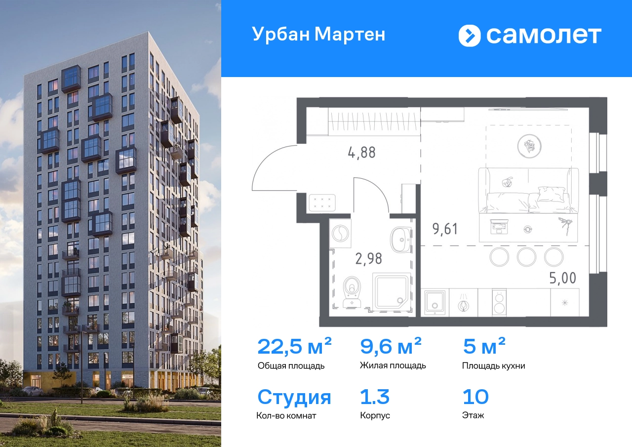 Строим кварталы для жизни с заботой о будущем. Предлагается квартира студия комфорт-класса 22,47 кв.м в корпусе 1.3 на 10 этаже, в ЖК «Урбан Мартен» Квартира с предчистовой отделкой. Доступность дополнительных опций уточняйте у застройщика. Приобрести квартиру возможно по специальным акциям от застройщика, с текущими условиями акций можно ознакомиться в блоке «Акций». Цена динамическая и может отличаться, уточняйте актуальность у застройщика. В жилом комплексе «Урбан Мартен» у вас будет собственная Уфа: домашняя, неторопливая, теплая. Здесь дети будут играть во дворе без машин в догонялки, собака сможет бегать за палкой по пляжу, а с соседями получится встречаться не только у лифта, но и на утренних занятиях йогой на зеленой лужайке рядом с домом. Жилой комплекс «Урбан Мартен» находится в Демском районе — самом тихом и зеленом в Уфе. Здесь можно открывать окна нараспашку, чтобы квартира наполнялась свежим воздухом, и наблюдать с балкона, как покачиваются макушки деревьев. #yan19-2r1815977#О застройщике