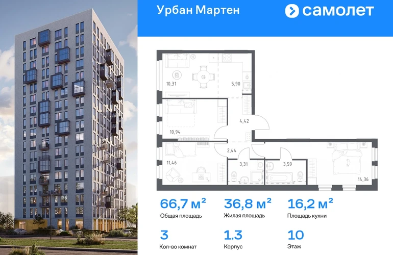 Строим кварталы для жизни с заботой о будущем. Предлагается 3-комнатная квартира комфорт-класса 66,73 кв.м в корпусе 1.3 на 10 этаже, в ЖК «Урбан Мартен» Квартира с предчистовой отделкой. Доступность дополнительных опций уточняйте у застройщика. Приобрести квартиру возможно по специальным акциям от застройщика, с текущими условиями акций можно ознакомиться в блоке «Акций». Цена динамическая и может отличаться, уточняйте актуальность у застройщика. В жилом комплексе «Урбан Мартен» у вас будет собственная Уфа: домашняя, неторопливая, теплая. Здесь дети будут играть во дворе без машин в догонялки, собака сможет бегать за палкой по пляжу, а с соседями получится встречаться не только у лифта, но и на утренних занятиях йогой на зеленой лужайке рядом с домом. Жилой комплекс «Урбан Мартен» находится в Демском районе — самом тихом и зеленом в Уфе. Здесь можно открывать окна нараспашку, чтобы квартира наполнялась свежим воздухом, и наблюдать с балкона, как покачиваются макушки деревьев. #yan19-2r1815978#О застройщике