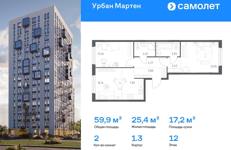 Строим кварталы для жизни с заботой о будущем. Предлагается 2-комнатная квартира комфорт-класса 59,88 кв.м в корпусе 1.3 на 12 этаже, в ЖК «Урбан Мартен» Квартира с предчистовой отделкой. Доступность дополнительных опций уточняйте у застройщика. Приобрести квартиру возможно по специальным акциям от застройщика, с текущими условиями акций можно ознакомиться в блоке «Акций». Цена динамическая и может отличаться, уточняйте актуальность у застройщика. В жилом комплексе «Урбан Мартен» у вас будет собственная Уфа: домашняя, неторопливая, теплая. Здесь дети будут играть во дворе без машин в догонялки, собака сможет бегать за палкой по пляжу, а с соседями получится встречаться не только у лифта, но и на утренних занятиях йогой на зеленой лужайке рядом с домом. Жилой комплекс «Урбан Мартен» находится в Демском районе — самом тихом и зеленом в Уфе. Здесь можно открывать окна нараспашку, чтобы квартира наполнялась свежим воздухом, и наблюдать с балкона, как покачиваются макушки деревьев. #yan19-2r1815982#О застройщике