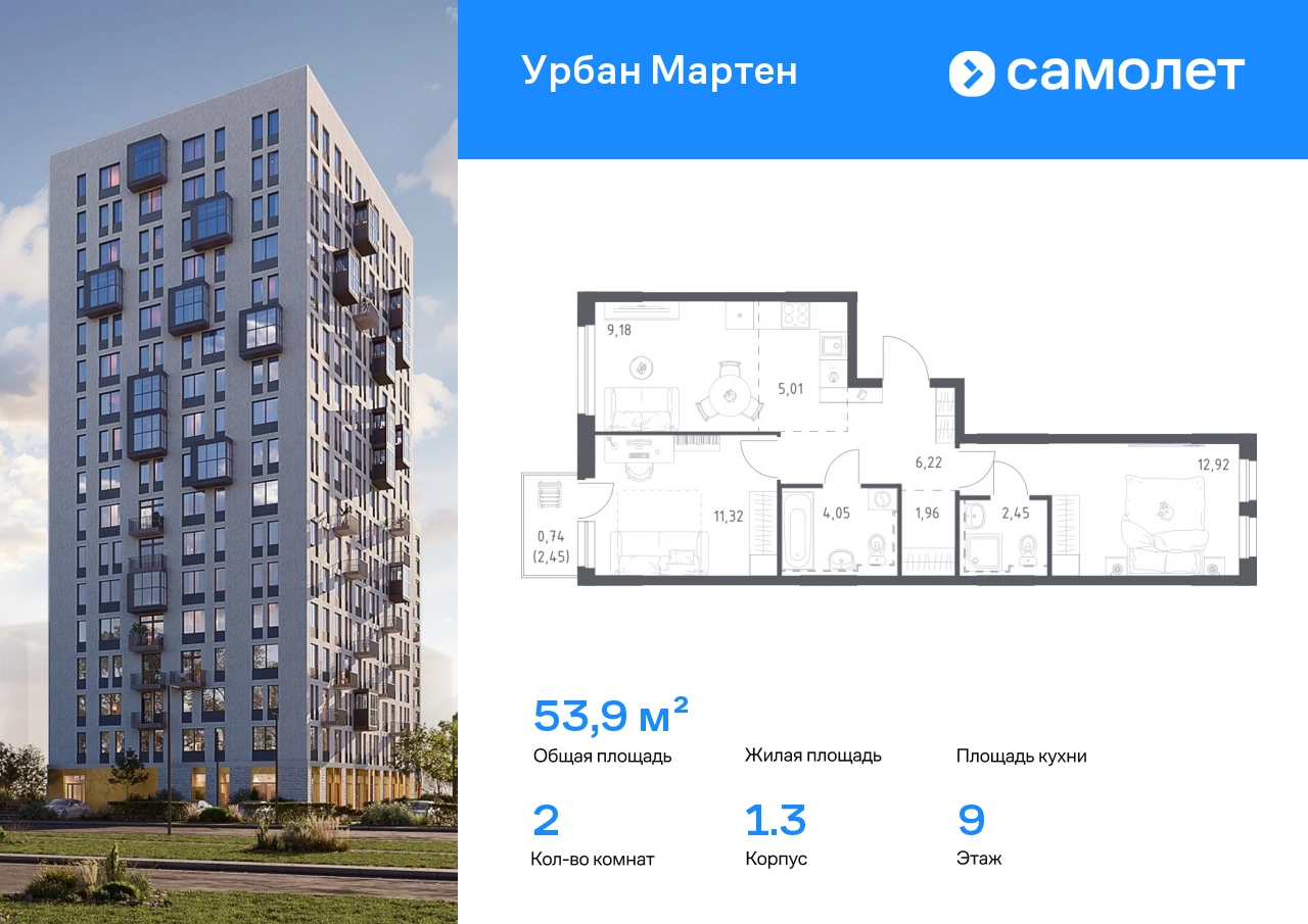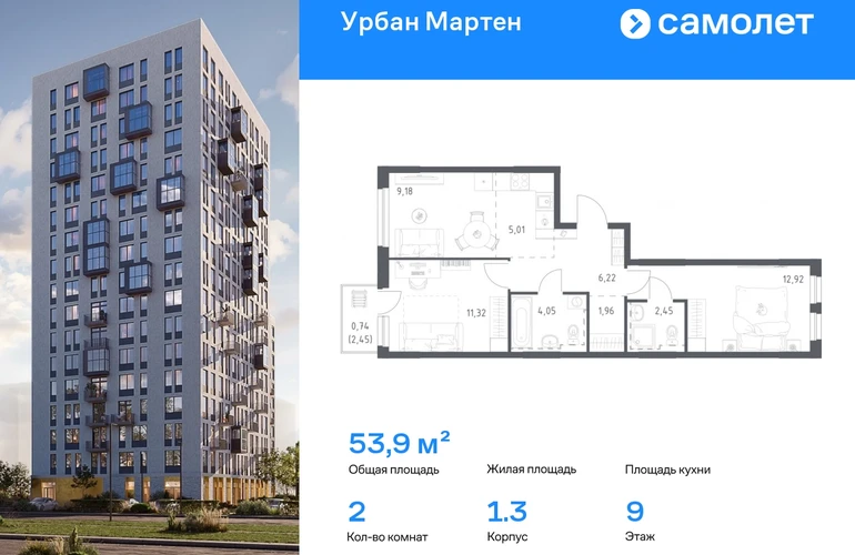 Строим кварталы для жизни с заботой о будущем. Предлагается 2-комнатная квартира комфорт-класса 53,85 кв.м в корпусе 1.3 на 9 этаже, в ЖК «Урбан Мартен» Квартира без отделки. Доступность опции «отделка» и возможность комплектации мебелью и декором уточняйте у застройщика. Приобрести квартиру возможно по специальным акциям от застройщика, с текущими условиями акций можно ознакомиться в блоке «Акций». Цена динамическая и может отличаться, уточняйте актуальность у застройщика. В жилом комплексе «Урбан Мартен» у вас будет собственная Уфа: домашняя, неторопливая, теплая. Здесь дети будут играть во дворе без машин в догонялки, собака сможет бегать за палкой по пляжу, а с соседями получится встречаться не только у лифта, но и на утренних занятиях йогой на зеленой лужайке рядом с домом. Жилой комплекс «Урбан Мартен» находится в Демском районе — самом тихом и зеленом в Уфе. Здесь можно открывать окна нараспашку, чтобы квартира наполнялась свежим воздухом, и наблюдать с балкона, как покачиваются макушки деревьев. #yan19-2r1819787#О застройщике