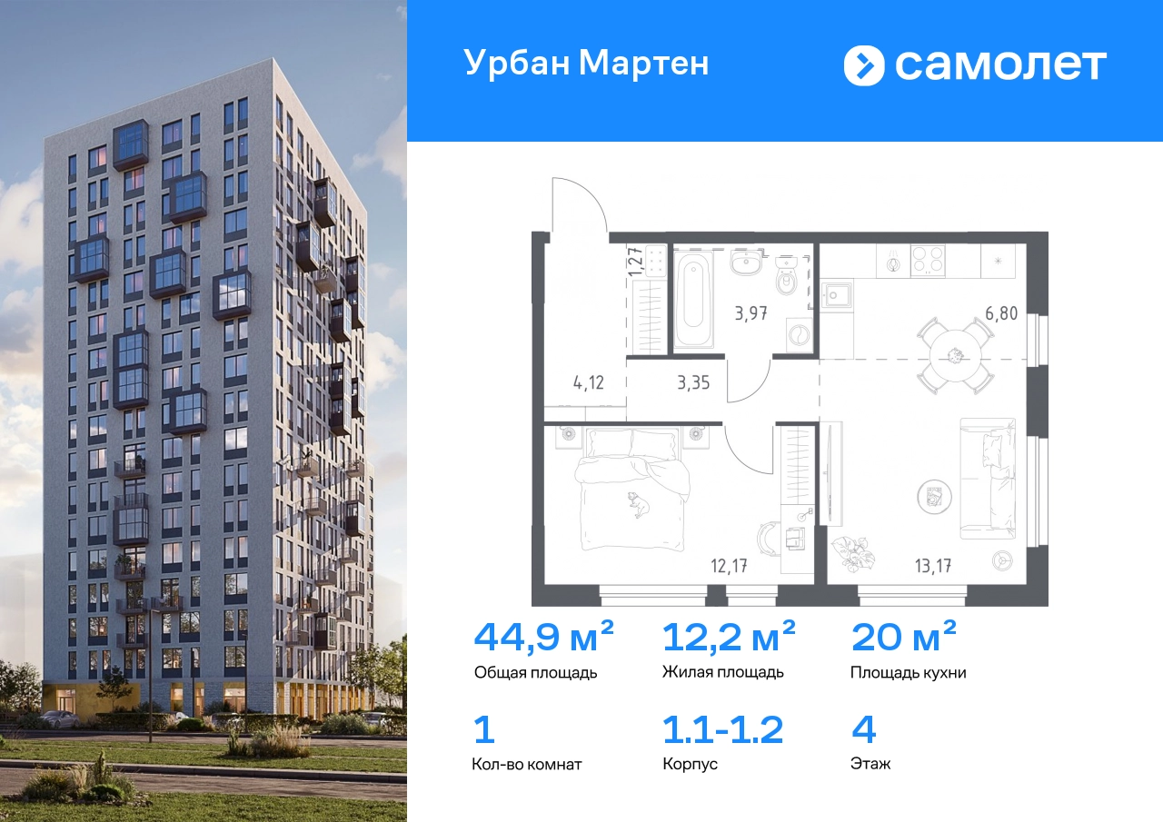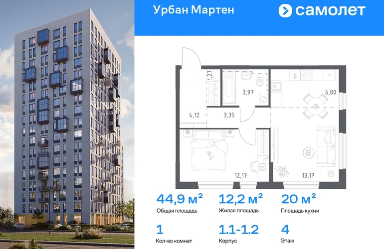 Строим кварталы для жизни с заботой о будущем. Предлагается 1-комнатная квартира комфорт-класса 44,85 кв.м в корпусе 1.1-1.2 на 4 этаже, в ЖК «Урбан Мартен» Квартира с предчистовой отделкой. Доступность дополнительных опций уточняйте у застройщика. Приобрести квартиру возможно по специальным акциям от застройщика, с текущими условиями акций можно ознакомиться в блоке «Акций». Цена динамическая и может отличаться, уточняйте актуальность у застройщика. В жилом комплексе «Урбан Мартен» у вас будет собственная Уфа: домашняя, неторопливая, теплая. Здесь дети будут играть во дворе без машин в догонялки, собака сможет бегать за палкой по пляжу, а с соседями получится встречаться не только у лифта, но и на утренних занятиях йогой на зеленой лужайке рядом с домом. Жилой комплекс «Урбан Мартен» находится в Демском районе — самом тихом и зеленом в Уфе. Здесь можно открывать окна нараспашку, чтобы квартира наполнялась свежим воздухом, и наблюдать с балкона, как покачиваются макушки деревьев. #yan19-2r1829933#О застройщике